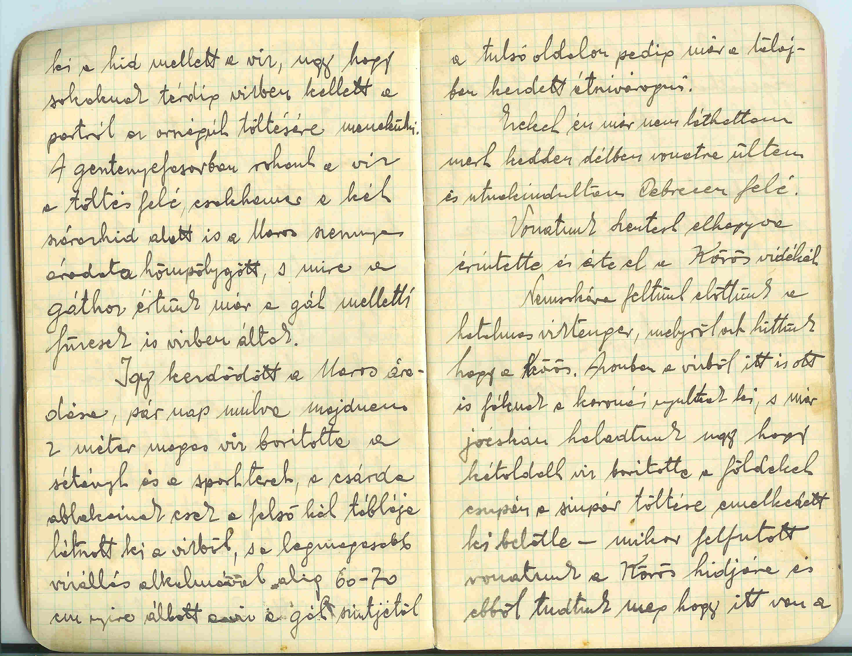 ki a híd mellett a víz, ugy hogy sokaknak térdig vízben kellett a partról az országút töltésére menekülni. A gesztenyefasorban rohant a víz a töltés felé, csakhamar a két szárazhíd alatt is a Maros szennyes áradata hömpölygött, s mire a gáthoz értünk, már a gát melletti füzesek is vízben áltak. Igy kezdődött a Maros áradása, s pár nap mulva majdnem 2 méter magas víz borította a sétányt és a sportteret, a csárda ablakainak csak a felső két táblája látszott ki a vízből, s a legmagasabb vízállás alkalmával alig 60-70 cm-nyire állott a víz a gát szintjétől a tulsó oldalon pedig már a talajban kezdett átszivárogni. Ezeket én már nem láthattam mert kedden délben vonatra ültem és elindultam Debrecen felé. Vonatunk Szentest elhagyva érintette és érte el a Kőrös vidékét. Nemsokára feltünt előttünk a hatalmas víztenger, melyről azt hittük, hogy a Kőrös. Azonban a vízből itt is ott is fáknak a koronái nyultak ki, s már jócskán haladtunk úgy, hogy kétoldalt is víz borította a földeket csupán a sinpár töltése emelkedett ki belölle - mikor felfutott vonatunk a Kőrös hídjára és ebből tudtuk meg, hogy itt van a 7.oldal Következő oldal |